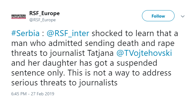 „Šokirani smo vešću da je čovek koji je priznao da je uputio pretnje smrću i silovanjem novinarki Tatjani Vojtehovski i njenoj ćerki osuđen na uslovnu zatvorsku kaznu. Ovo nije način na koji se postupa s ozbiljnim pretnjama upućenim novinarima“, naveli su iz RBG na svom Tviter nalogu.