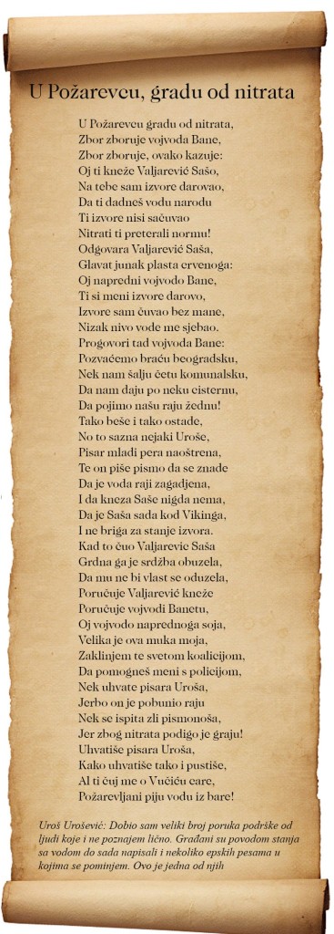 Narednog dana direktor Vodovoda se ne javlja na telefon. Saznajem da je u Švedskoj. Niko se ne bavi nitratima, niti je to bila tema sastanaka Gradskog veća u Požarevcu. Sednice nisu javne, o njima se ne obaveštavaju mediji. Kada zatražite neki dokument, pitaju vas zašto vam to treba. Nema vremena za zvanične zahteve. Informaciju dobijam nezvanično, u razgovorima sa članovima veća. Nitrati su i do 20 procenata iznad dozvoljene granice. Niko neće da kaže da voda nije za piće. Ja ću reći otvoreno.