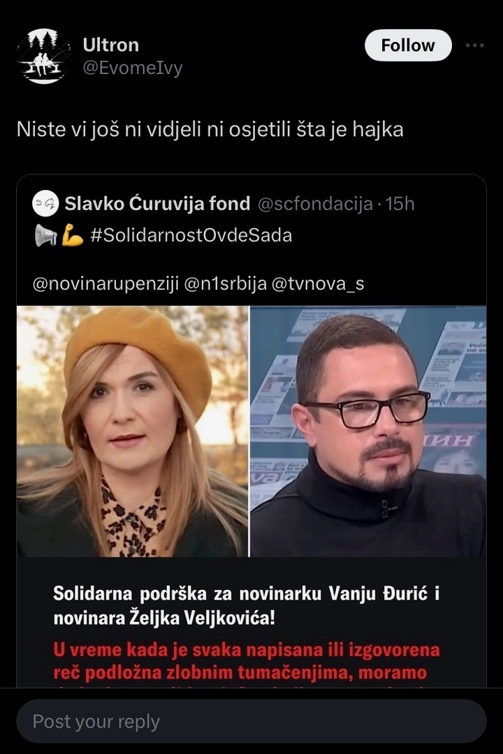 Pretnje i uvrede su dobijali i oni koji su podržali Vanju Đurić i Željka Veljkovića. Slavko Ćuruvija fondaciji, koja je izrazila podršku novinarima N1 i Nove S i napisala da „u vreme kada je svaka napisana ili izgovorena reč podložna zlobnim tumačenjima“ moramo da ostanemo solidarni, te da hajka mora da prestane, poručeno je „niste vi još ni vidjeli šta je hajka“.