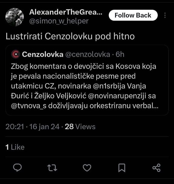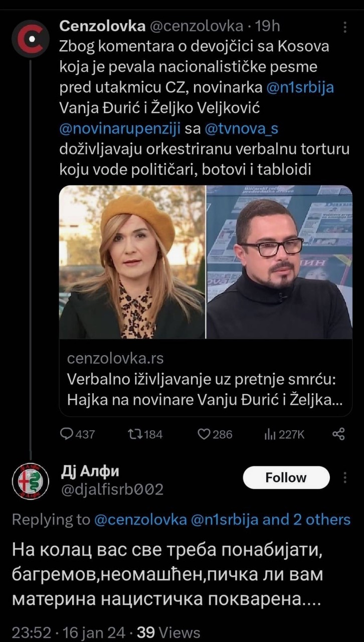 Tekst koji je objavila Cenzolovka o verbalnoj torturi koju prolaze novinari i pretnjama smrću koje su dobili Vanja Đurić i Željko Veljković, u kome su oni objasnili da nisu imali nikakve loše namere, niti su vređali devojčicu Pavlinu Radovanović, izazvao je na mreži X salvu uvreda i novih pretnji na račun Vanje, Željka i naše redakcije.
