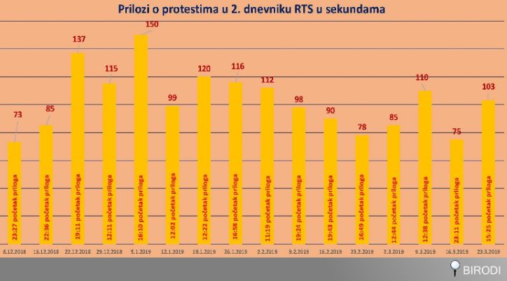 Novi monitoring BIRODI-ja, koji se fokusirao samo na Drugi dnevnik RTS-a koji se emitovao subotom, od 8. decembra 2018. do 23. marta 2019. godine, kada se dešavaju protesti na ulicama Beograda i drugih gradova, pokazao je i da izveštaji nisu nijednom bili udarna vest, te da su se oni uglavnom emitovali posle 15. minuta te informativne emisije. Analizom nije obuhvaćeno izveštavanje o protestima u Trećem dnevniku, kao ni u ostalim informativno-političkim emisijama javnog servisa.