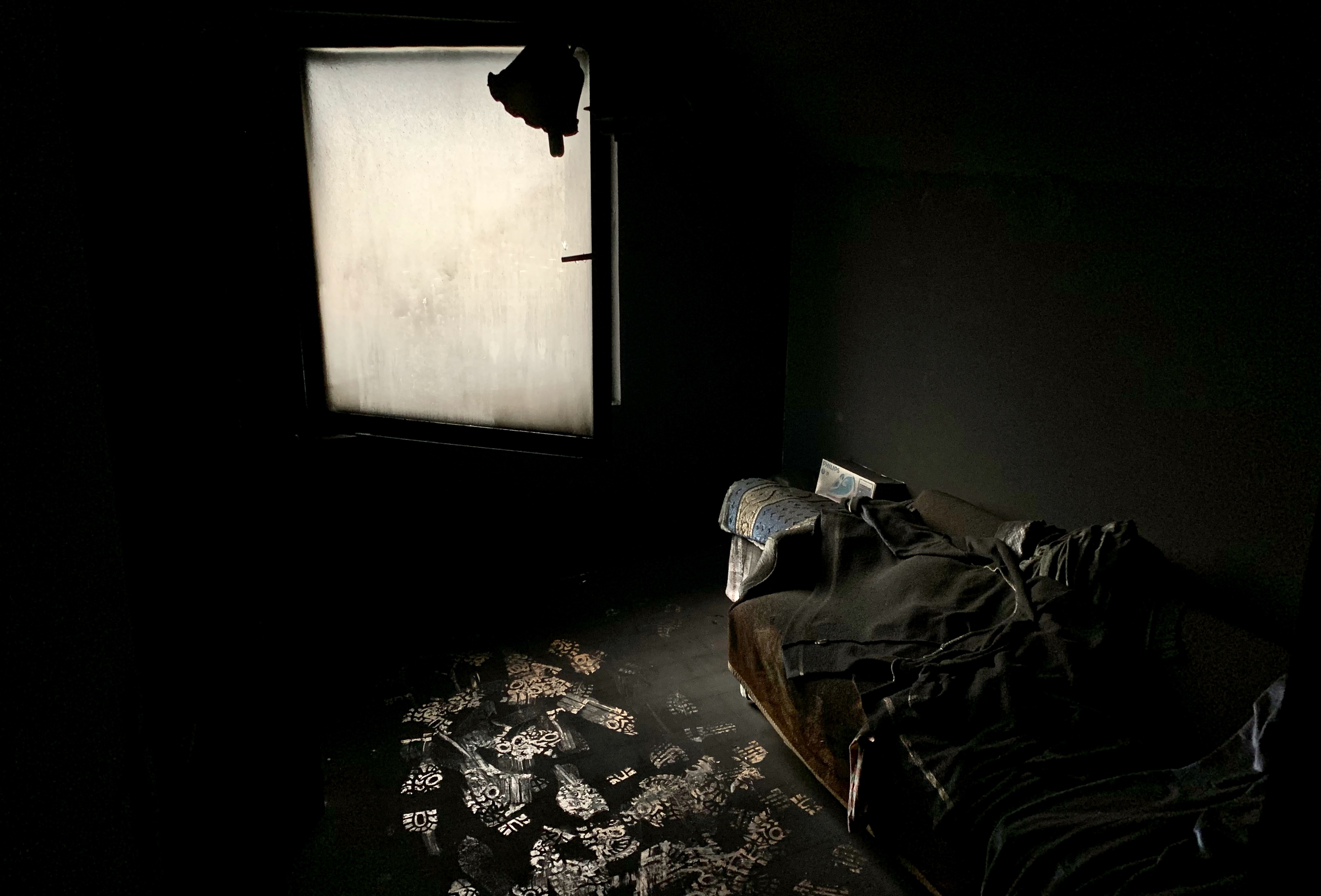 Sve je na podu izmešano: knjige pocrnelih korica, napola izgoreli papiri, parčići tepiha koji se raspadaju pod težinom koraka, posteljina, ostaci maltera sa zidova, odeća…