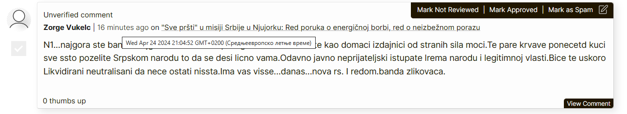 Sedamesettrogodišnji muškarac koji se potpisao pseudonimom, u pretnji koja je stigla na adresu N1 između ostalog je napisao da su novinari N1 najgora banda, da su plaćeni kao domaći izdajnici od stranih sila moći i da odavno javno neprijateljski istupaju prema narodu i legitimnoj vlasti. „Bićete uskoro likvidirani neutralisani da neće ostati ništa“, napisao je čovek koga je Tužilaštvo otkrilo.