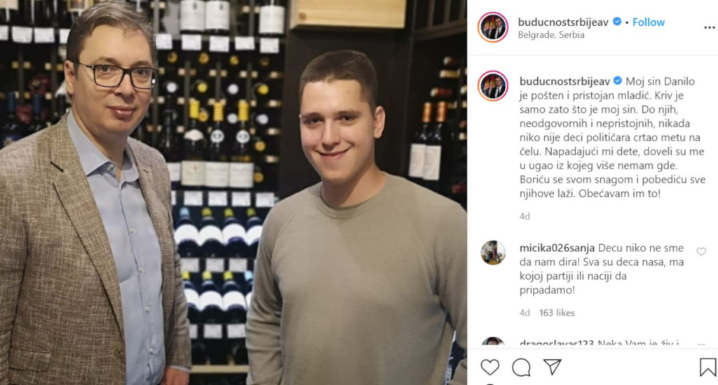 „Pored toga, sin predsednika Republike je viđen u javnosti sa osobom protiv koje se trenutno vodi sudski postupak za nasilničko ponašanje, kao i istraga zbog razbojništva i krivičnog dela nedozvoljene proizvodnje, držanja, nošenja i prometa oružja i eksplozivnih materija. Najzad, sin predsednika Republike je viđen sa članovima huliganskih grupa Alkatraz i Janičari, koje se povezuju sa nasilnim incidentima koje su prouzrokovale najteže posledice kao što su ubistvo Brisa Tatona ili Slobodana Vukića. Potencijalno je opasno da član porodice visokog državnog funkcionera čija je bezbednost često ugrožena, barem po izjavama političara i izveštavanju medija, bude fotografisan sa osobom koja se povezuje sa kriminalom”, piše Đorđević.