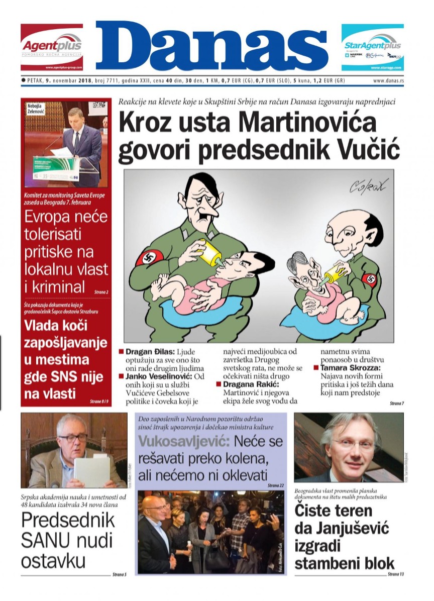 Kako je objavila nepostojeća agencija „Tanjug“, a preneli brojni onlajn mediji, „na pitanje da pokomentariše karikaturu na kojoj je povezan s Hitlerom i da kroz usta šefa poslaničkog kluba SNS u Skupštini Srbije Aleksandra Martinovića on govori, Vučić je u Briselu rekao: „O čemu je reč? A šta je rekao Martinović? A ja Hitler? A meni hitlerovci pobili celu familiju. Ali, dobro, šta ćete, to je demokratija u Srbiji“.