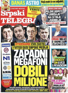 Provladin tabloid Srpski telegraf objavio je danas svoje “istraživanje” u kojem, po ko zna koji put otakako je pod uticajem režima Aleksandra Vučića, tvrdi da nezavisne medije u Srbiji finansiraju zapadne vlade, ambasade, Bela kuća, Evropska komisija, Rokfeler, Soroš…