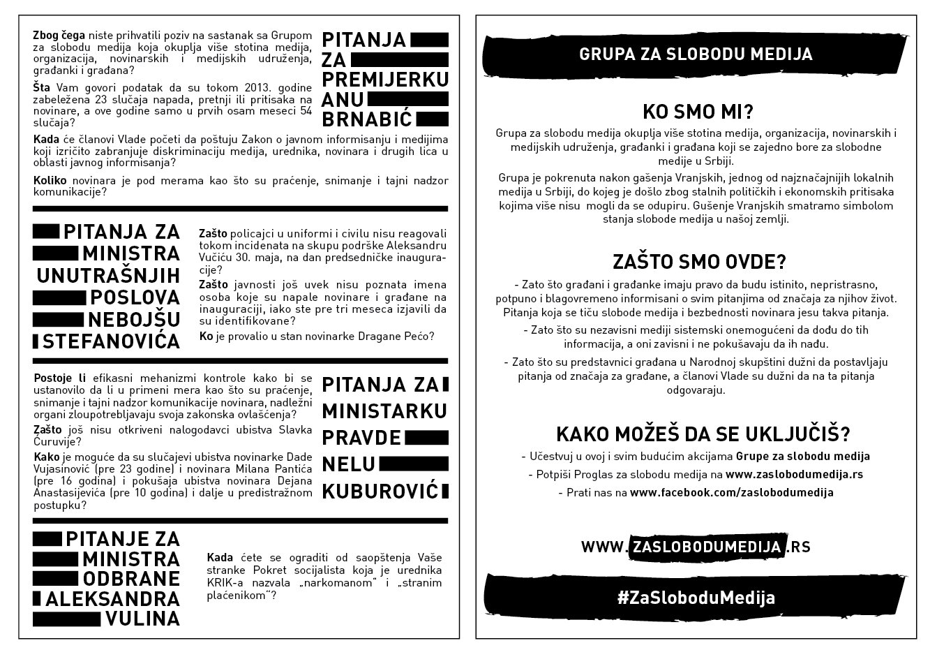 Premijerki je u letku, između ostalog, postavljeno pitanje zašto nije prihvatila poziv na sastanak sa grupom za slobodu medija, koja okuplja više stotina medija, organizacijaca, novinarskih i medijskih udruženja.