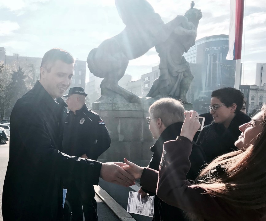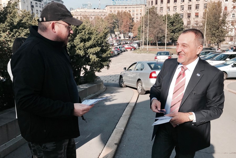 Antonela Riha, Danica Vučenić i Marko Somborac uručuju letak Žarku Obradoviću (Foto: P. Gunjić / Cenzolovka)