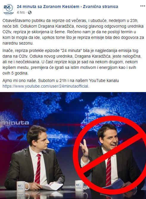 Ekipa emisije „24 minuta sa Zoranom Kesićem“ saopštila je večeras da je odlukom glavnog i odgovornog urednika Televizije O2 Dragana Karadžića repriza te emisije, čiji je termin bio nedeljom u 23 časa, uklonjena iz programske šeme.