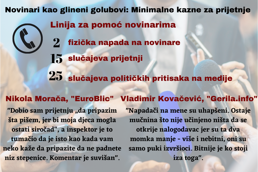 „Zaprijećene kazne su niske, postupci u slučaju napada na novinare i medije su većinom prekršajni, a ne krivični. S druge strane tužilaštvo u većem broju slučajeva donese odluku o nesprovođenju dalje istrage navodeći da nema elemenata krivičnog djela“, naglašavaju u Udruženju „BH novinari“.