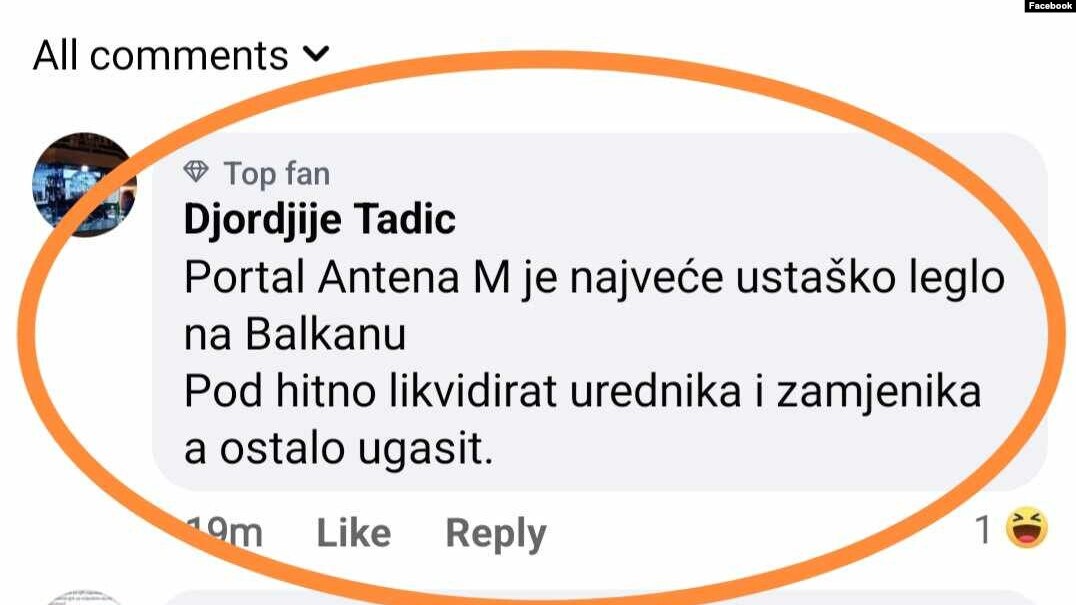 „Portal Antena M je najveće ustaško leglo na Balkanu. Pod hitno likvidirat urednika i zamjenika, a ostalo ugasit“, naveo je korisnik u komentaru na Fejsbuku.