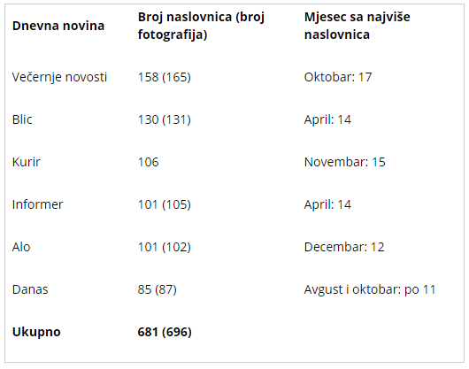 Bez ulaženja u njihov cjelokupan sadržaj, cilj analize je bio da se prikaže slika kakvu dobijaju oni koji ne čitaju štampu, nego samo pogledaju naslovne stranice – a takvih ima dosta.
