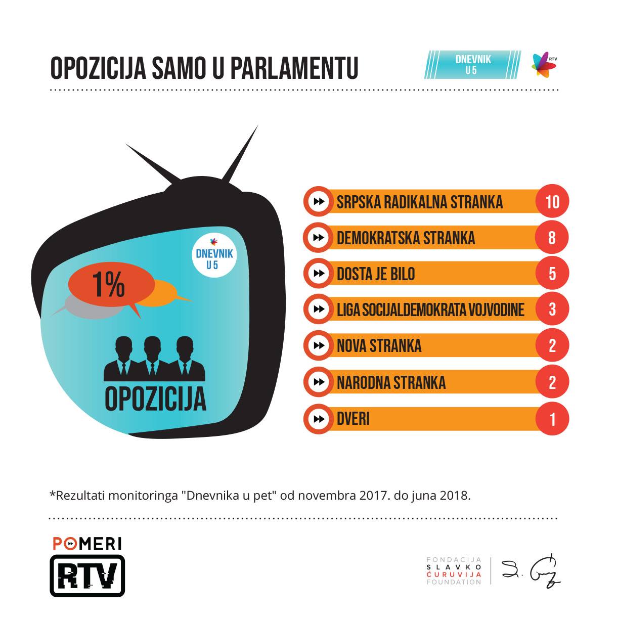 O predstavnicima opozicije se duplo više govorilo nego što su oni imali priliku da govore, a najčešće su o njima govorili nosioci funkcija, koji su uglavnom kritikovali opoziciju u celini, ne izdvajajući pojedinačne stranke, pokazao je osmomesečni monitoring informativnih emisija RTV-a. Među onima koji su o opoziciji govorili bio je i kolegijum RTV-a kada je tražio od Dragana Đilasa da ne vrši pritisak na RTV.