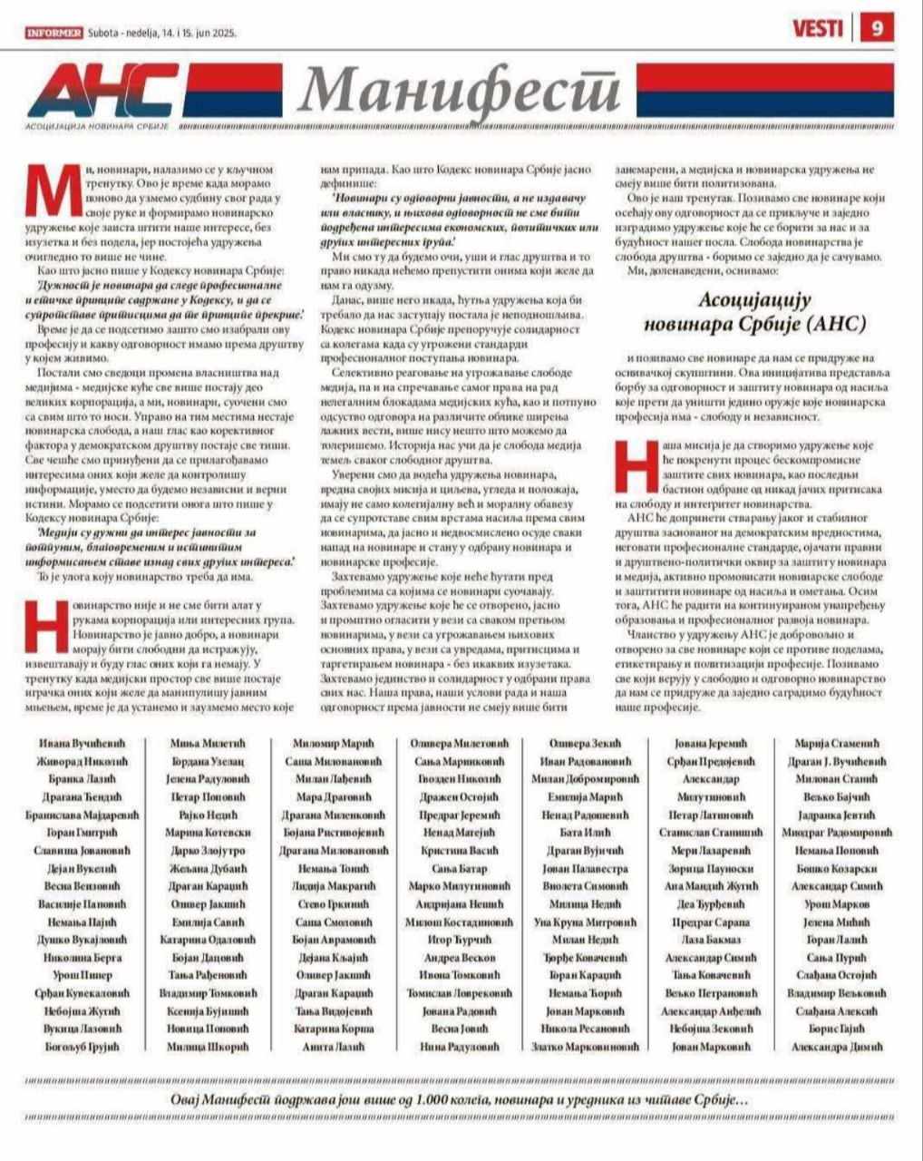 Oni tvrde da „ovaj Manifest podržava još više od 1.000 kolega, novinara, i urednika iz čitave Srbije“