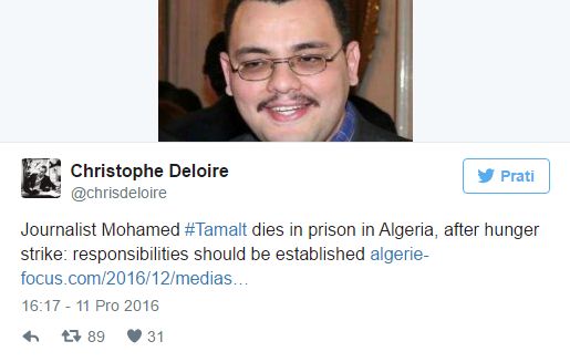 Britansko-alžirski novinar Mohamed Tamalt koji je u srpnju ove godine osuđen na dvije godine zatvora jer je uvrijedio predsjednika Abdelaziza Buteflike, umro je u nedjelju nakon štrajka glađu zbog kojeg je pao u komu, objavio je njegov odvjetnik, pišu strani mediji.