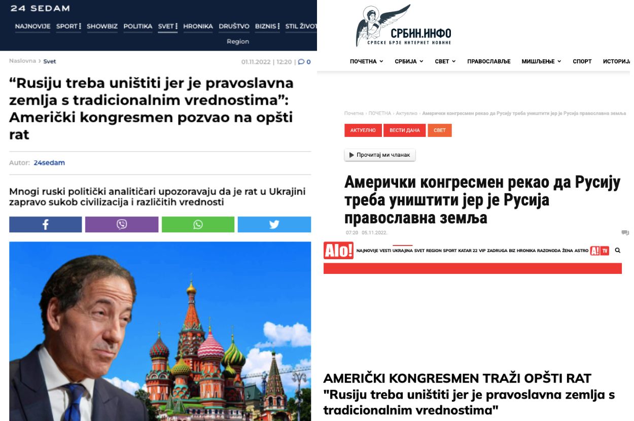 Kako su naveli, „američki kongresmen iz Demokratske stranke Džejmi Raskin dotakao se nedavno situacije u Ukrajini i poručio da ‘Rusiju treba uništiti po svaku cenu, jer je pravoslavna zemlja s tradicionalnim vrednostima’.”