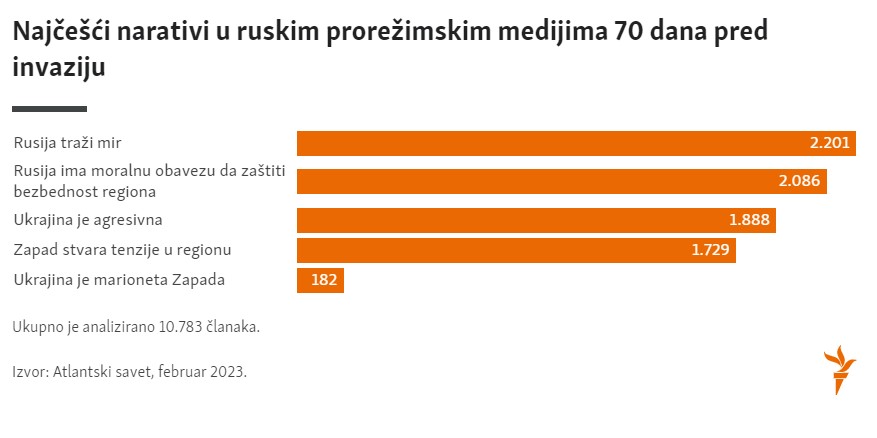 Laboratorija za digitalno forenzičko istraživanje pri Atlantskom savetu je identifikovala i analizirala prorežimske narative u dva vremenska perioda, od 2014. do 2021. godine i u periodu od 70 dana uoči početka ruske invazije.