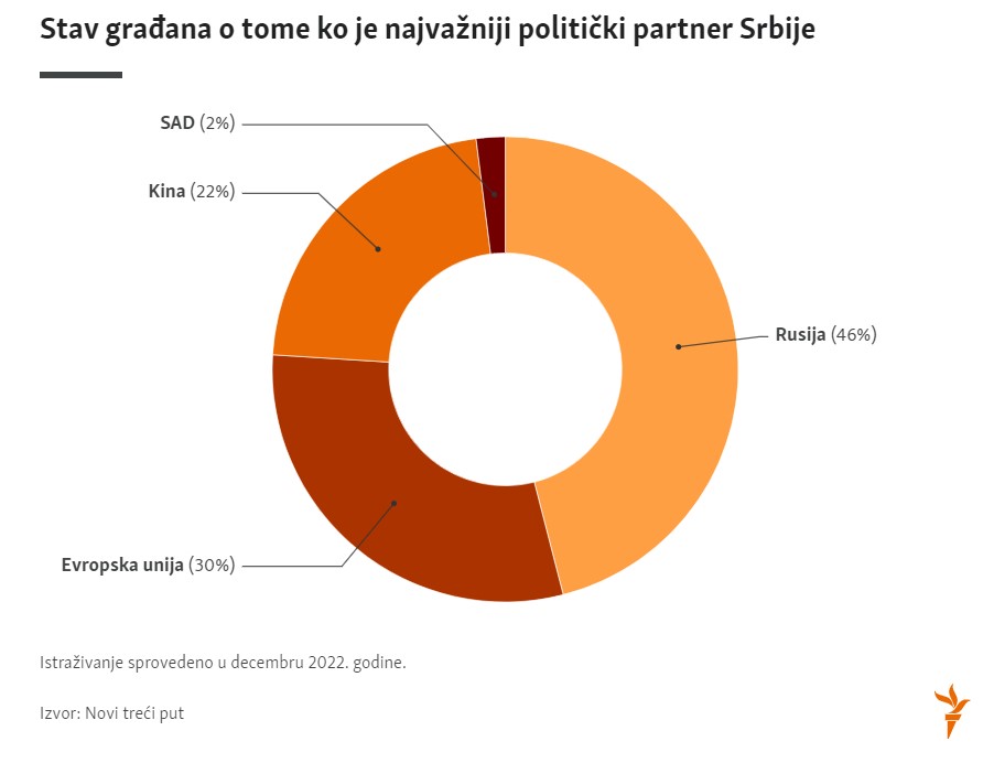 Na pitanje koga smatraju najvažnijim političkim partnerom, gotovo polovina ispitanika je navela da je to Rusija, a manje od trećine da je to Evropska unija.
