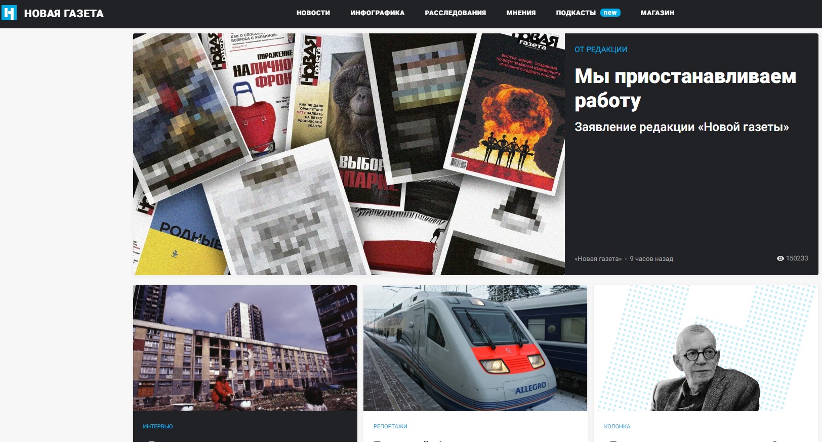 Nova Gazeta nastavila je da radi pošto je iz Moskve otišla većina stranih dopisinika zapadnih medija, bili blokirani i DW i Radio Sloboda i ruska televizija TV Dožd i legendarna radio stanica Eho Moskve.