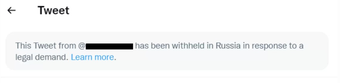 „Ovaj tvit od @… povučen je u Rusiji kao reakcija na sudski zahtev.“