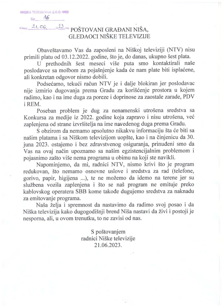 Prošlo je 200 dana od početka blokade računa Niške televizije (NTV) i nedelju dana od kada je voditelj u vestima NTV-a pročitao saopštenje u kome su zaposleni izrazili nezadovoljstvo jer šest meseci nisu primili plate. Iz NTV-a za sajt UNS-a kažu da ih rukovodstvo, umesto da im isplati zaostale zarade, poziva da daju otkaz.