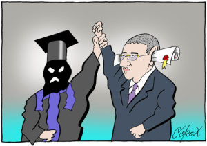 Karikaturista Dušan Petričić komantarišući godinu za nama priznaje da mu je nekada problem kako da izbegne premijera Aleksandra Vučića u svojim karikaturama. Kako kaže, on je dominantan u našim životima i meša se u sve u njima. Inspiraciju za novu karikaturu vidi u formiranju Pomoćne policije.