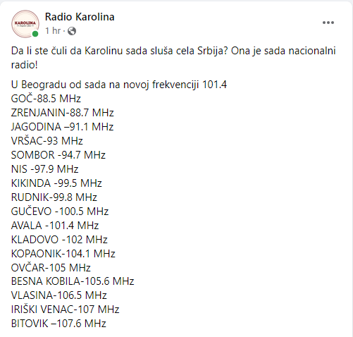 Na Fejsbuk stranici Radija Karolina danas je objavljen sledeći post: „Da li ste čuli da Karolinu sada sluša cela Srbija? Ona je sada nacionalni radio!“