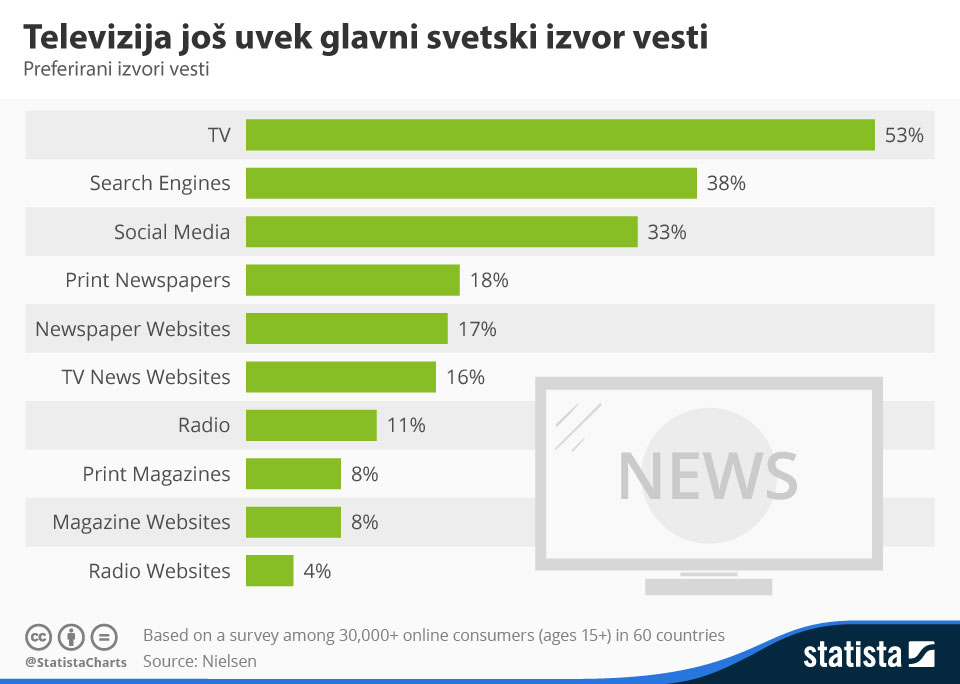 Uprkos rastu internet sajtova i pretraživača kao alternativnim izvorima vesti, televizija je još uvek glavni globalni izvor informisanja, rezultati su Nielsen ankete u kojoj je učestvovalo preko 30.000 ljudi iz 60 zemalja