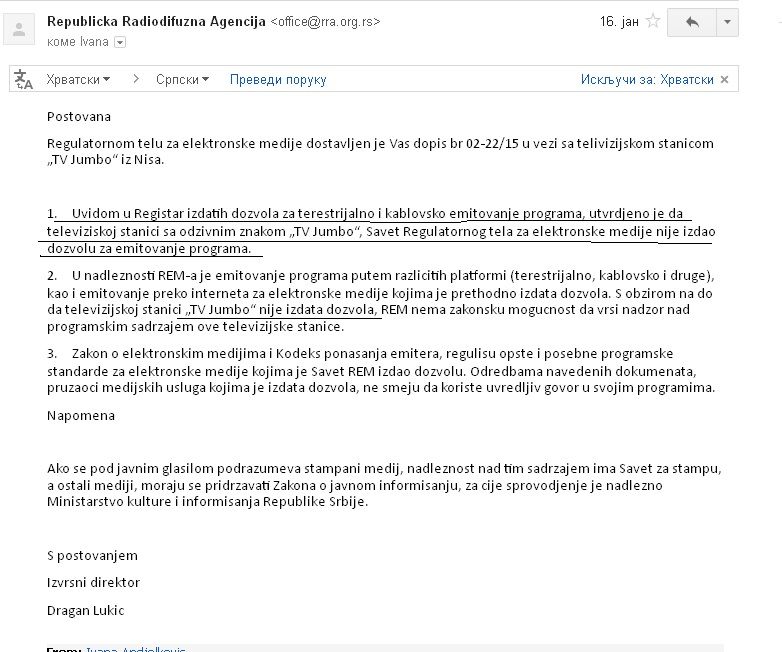 - 2. U vreme kada je Naisus potpisao ugovor za medijsko praćenje na TV Jumbo, TV Jumbo nije imao dozvolu za emitovanje programa. TO JE ISTINA