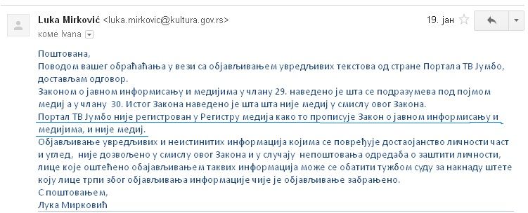 - 3. Da portal TV Jumbo „nije registrovan u Registru medija kako to propisuje Zakon o javnom informisanju i medijima i da nije medij“, zvaničan je stav Ministarstva kulture koji smo dobili u januaru 2015.godine. TO JE ISTINA Portal je registrovan u APR-u kao javno glasilo 31.decembra 2014.godine i to sa osnivačem udruženjem Lokalna demokratska ideja a u registar Medija upisan je 13.februara 2015.godine kada su podaci iz registra javnih glasila po službenoj dužnosti prevedeni u Registar medija