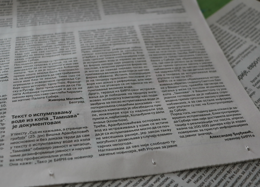 U tekstu „Sud ih kažnjava, a stranci nagrađuju“ Višnja Aranđelović neosnovano i bez dokaza tvrdi da sam lažov i da sam u tekstu o ispumpavanju vode iz kopa Tamnava obmanuo javnost i čitaoce, čime novinarka Politike dezinformiše javnost i narušava moj profesionalni ugled