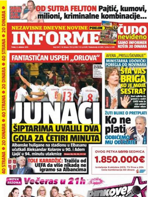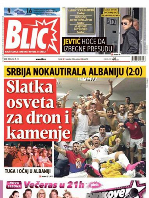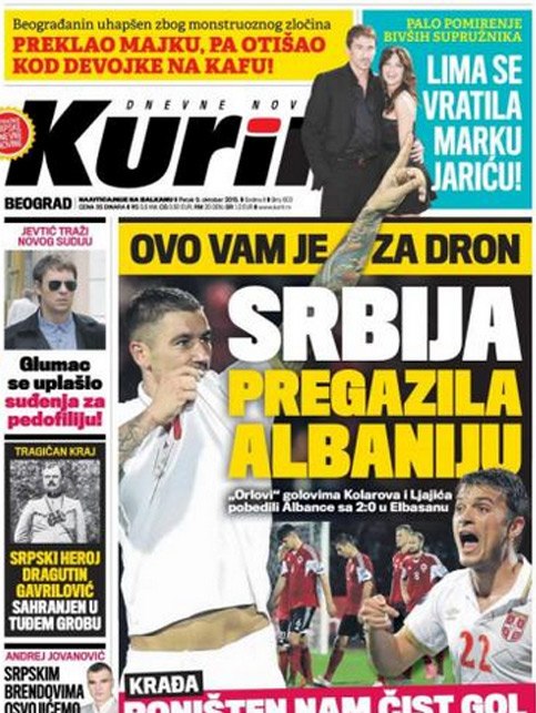 Sinoć je u Elbasanu odigrana jedna od najrizičnijih utakmica u sklopu kvalifikacija za Euro 2016. u Francuskoj, ona između Albanije i Srbije. Iako nemaju nikakve šanse plasirati se na Euro, izabranici Radovana Ćurčića upisali su pobjedu protiv Albanije 2:0, golovima Aleksandra Kolarova i Adema Lljajića u sudačkoj nadoknadi.