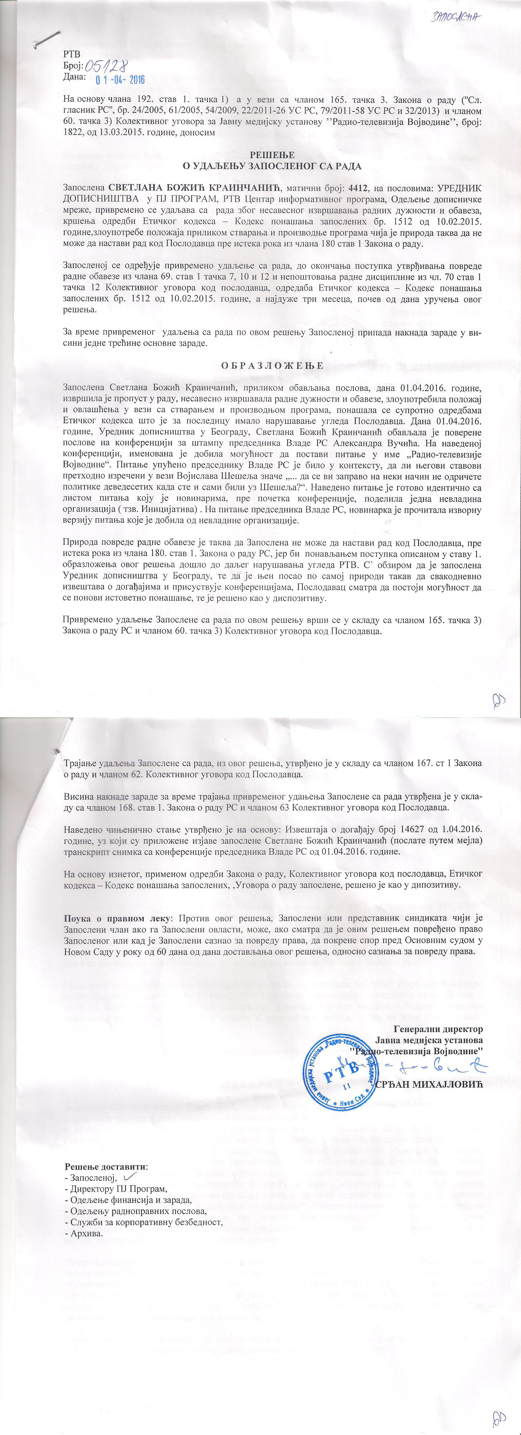 Konačna odluka direktora, u formi rešenja kojim je novinarka kažnjena umanjenjem aprilske plate za 20 odsto, usledila je zaista već u utorak. U rešenju se ponavlja argumentacija iz prethodnih akata, ali i dodaje: