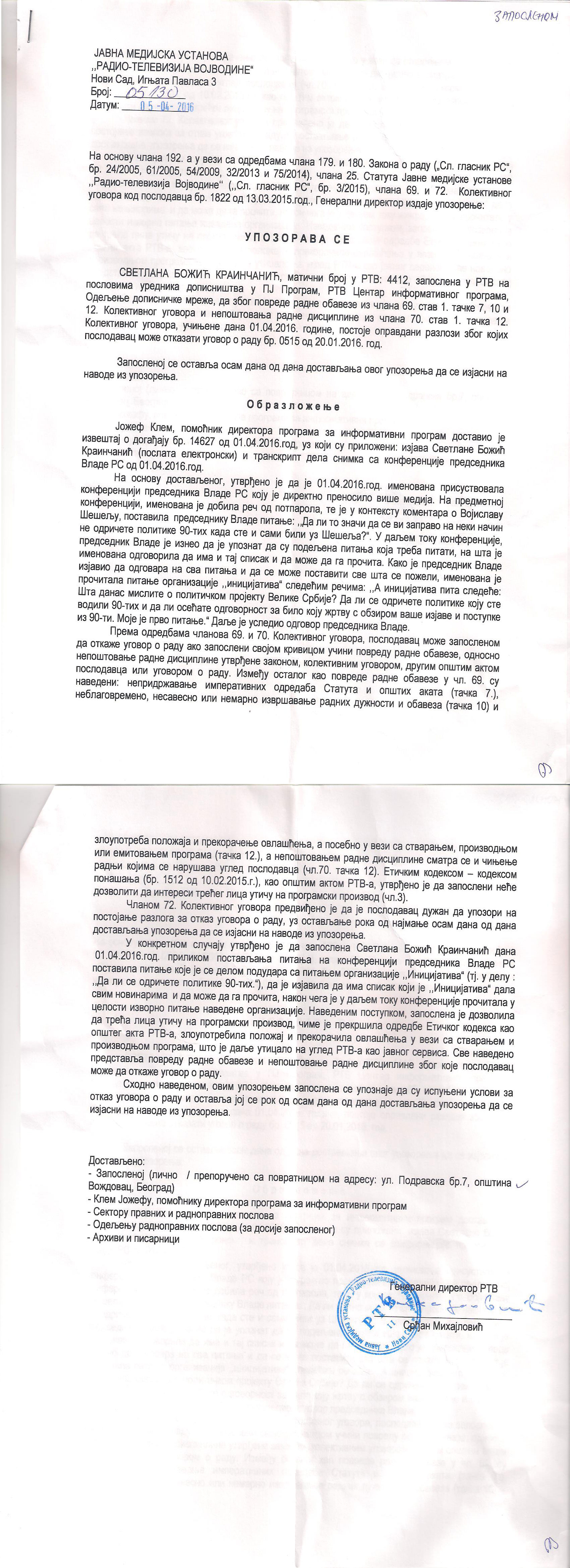 Potom je Svetlana Božić Krainčanić 5. aprila dobila upozorenje da zbog povrede radne obaveze postoje opravdani razlozi zbog kojih joj poslodavac može otkazati ugovor o radu. U ovom upozorenju je objašnjeno da je ona povredila član 3 Kodeksa, koji kaže da „zaposleni neće dozvoliti da interesi trećeg lica utiču na programski proizvod“. Postavlja se pitanje, međutim, šta ako su to „treće lice“ građani zbog kojih javni servis i postoji.