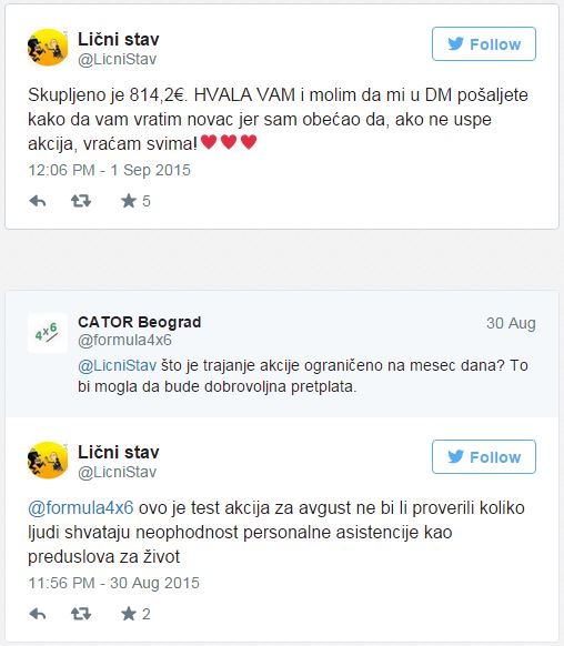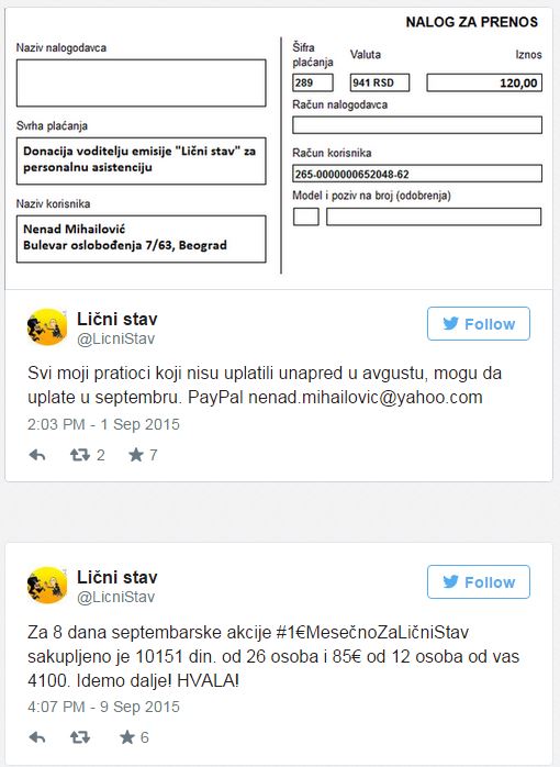 Početkom avgusta Nenad Mihailović pokreće na Tviteru akciju #1€MesečnoZaLičniStav, sa idejom da u jednom mesecu prikupi od jedne četvrtine svojih Tviter pratilaca (4.000+ pratilaca) – 1.200 €, jedan euro po pratiocu, koliko mu je potrebno da bi preživeo kao invalid.