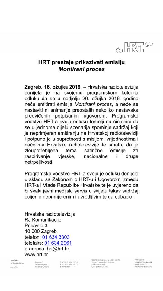 „Programsko vodstvo HRT-a svoju odluku temelji na činjenici da se u jednome dijelu scenarija spominje sadržaj koji je neprimjeren emitiranju na Hrvatskoj radioteleviziji i potpuno je u suprotnosti s misijom, vrijednostima i načelima Hrvatske radiotelevizije te smatra da je zloupotrebljena tema satirične emisije za raspirivanje vjerske, nacionalne i druge netrpeljivosti.