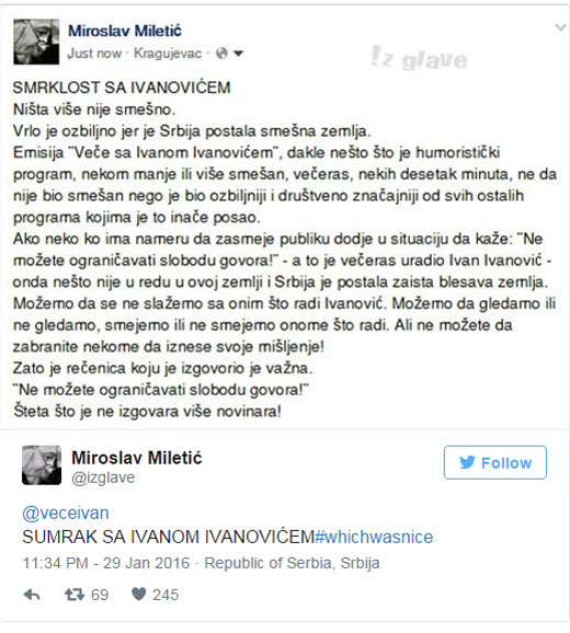 Ivanović se založio za slobodu govora, a njegovo obraćanje je izazvalo veliki broj komentara podrške na društvenim mrežama.