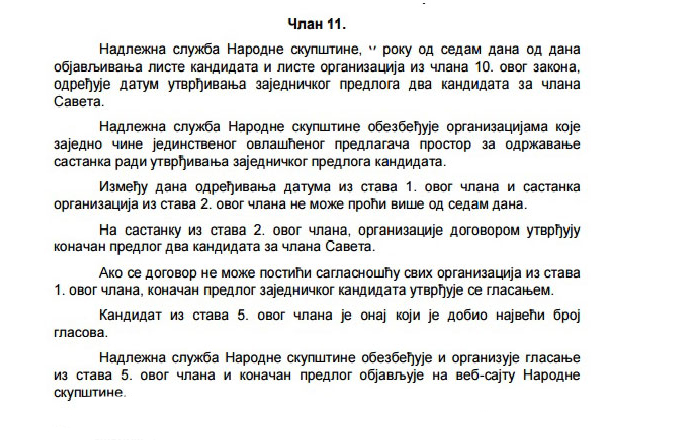 Prema tumačenju Odbora za ustavna pitanja, članom 11 stav 4, 5 i 6 Zakona o elektronskim medijima, propisano je da organizacije dogovorom utvrđuju konačan predlog dva kandidata za člana Saveta Regulatornog tela za elektronske medije. Ako se dogovor ne može postići saglasnošću, svaka organizacija glasa za jednog kandidata, nakon čega se utvrđuje konačan predlog dva kandidata.