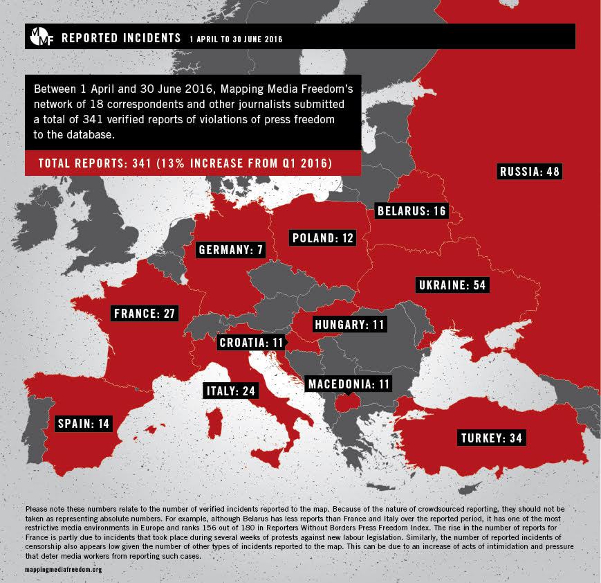 Između 1. travnja i 30 lipnja 2016. mreži Mapping Media Freedom 18 dopisnika i drugih novinara podnijelo je 341 provjereni izvještaj o nasilju nad novinarima i ugrožavanju slobode medija, 13% više nego u prvom kvartalu 2016.