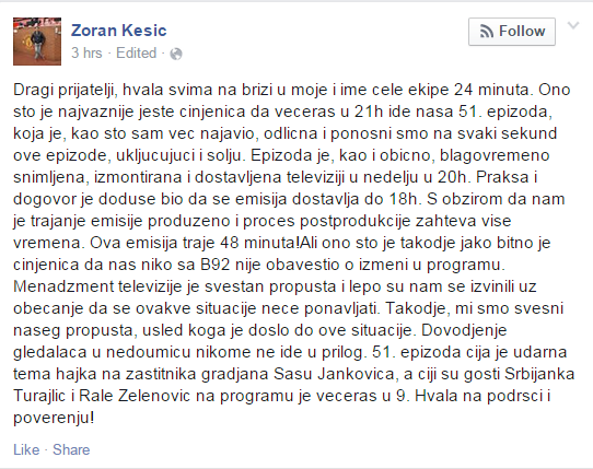Sinoć je trebalo da bude emitovana najnovija epizoda „24 minuta sa Zoranom Kesićem“ u kojoj bi se, između ostalog, razmatrao slučaj zaštitnika građana Saše Jankovića, kraj štrajka prosvetara kao i prodaja Avala filma, ali reprizirana je epizoda koja je bila emitovana prošle nedelje. Kesić i ekipa emisije sinoć su obavestili javnost da ne znaju šta se tačno desilo i zašto je emitovana repriza