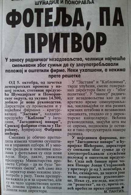 Posebno su isticani njegovi tekstovi o Jagodinskoj pivari. Tokom akcije „Sablja“ u aprilu 2003, posle ubistva premijera Zorana Đinđića, privođeni su direktor Jagodinske pivare Jovan Stojanović i bivši načelnik policije u Jagodini Živojin Trifunović.