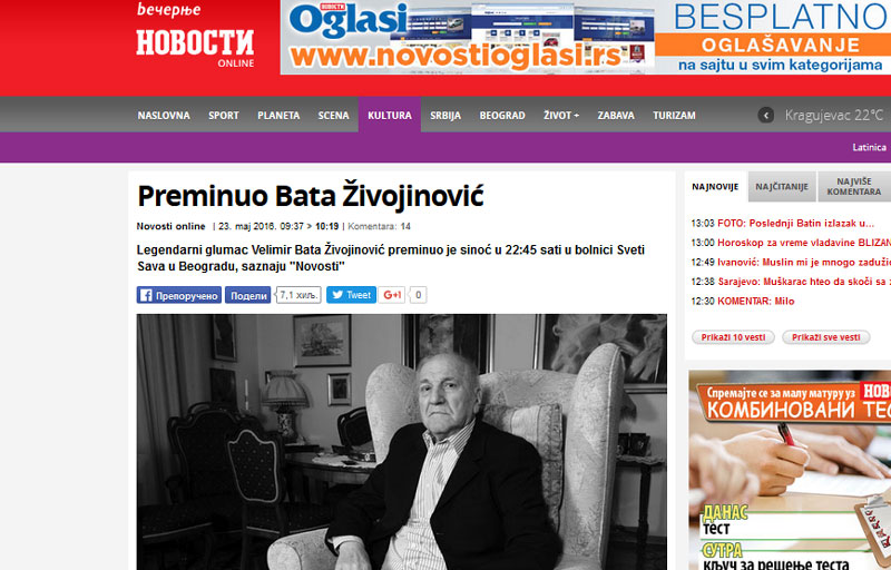 Večernje novosti su na svom sajtu, prve obavestile domaću, zašto ne reći i evropsku javnost, da je preminuo legendarni glumac. Ne hvalimo se, konstatujemo. Evo zbog čega