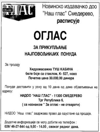 U javnom pozivu Agencije za privatizaciju za prodaju kapitala 11 medijskih kuća uvršteno je i Novinsko izdavačko društvo s ograničenom odgovornošću „Naš glas“ iz Smedereva, koje je na svojim stranama objavilo da prikuplja ponude za prodaju hidromasažne tuš kabine