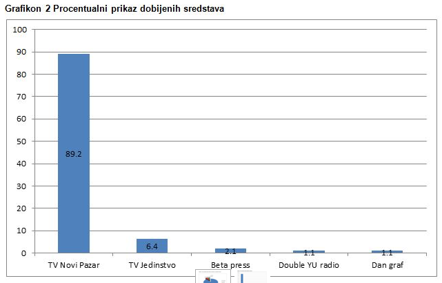 Naime, televizija Novi Pazar u kojoj je od vlasnika Muzafer Dragulovčanin, pomoćnik gradonačelnika Novog Pazara dobila je skoro 90% odobrenih sredstava. Na drugom mestu ke mediji sa šest procenata finansija je odobreno TV Jedinstvo čiji jevlasnik i direktor Šerif Marukić, potpredsednik Skupštine Grada.