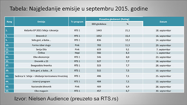 Prema podacima RTS, u prvih devet meseci 2015, Prvi program RTS-a je 218 dana bio najgledaniji TV program u Srbiji, TV Pink 51, a TV Hepi četiri dana. U septembru je Prvi program RTS-a bio najgledaniji 21 dan, a TV Pink 9 dana. Kad je reč o rejtingu, prvi program RTS-a je i u septembru 2015 najgledaniji TV program sa ostvarenim rejtingom od 3,6 odsto. Na drugoj poziciji je TV Pink (3,2%), a na trećoj TV Hepi (2,4%). Slede TV Prva (1,6%), TV B92 (1,0%) i Drugi program RTS-a (0,5%). Na rang listi 50 najgledanijih emisija u septembru više od polovine (32) su emisije Prvog programa RTS-a, 14 TV Pinka, tri TV Hepija i jedna emisija TV Prve.