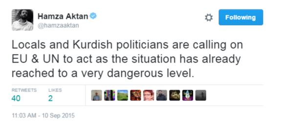 Tweet 1: Lokalni i kurdski političari pozivaju EU i UN da djeluju na način kao da je situacija već dosegla veoma opasnu razinu.
