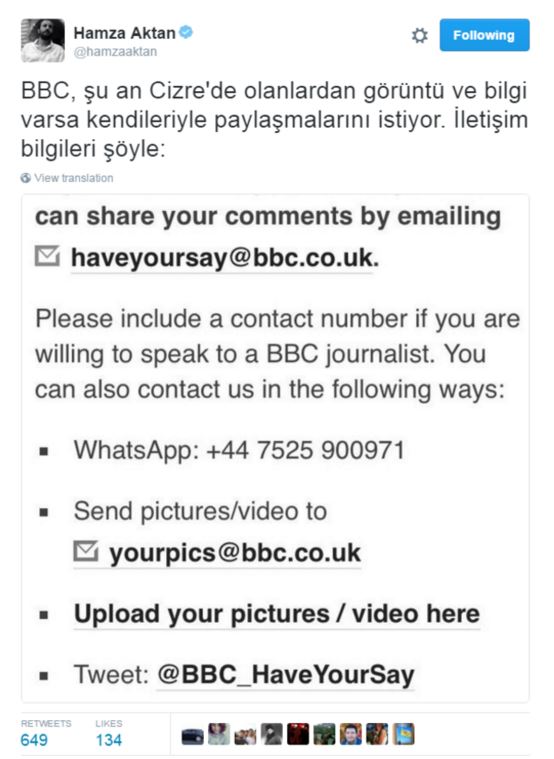 Tweet 2: BBC traži informacije i fotografije ljudi koji su trenutačno u Cizri. Ovdje se nalaze kontakti BBC-a.