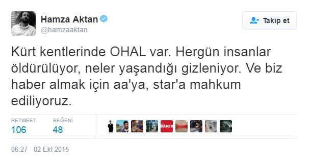„Maskirani policajci iz antiterorističke postrojbe pretražili su mi stan u Istanbulu te me odveli u pritvor. Vlasti koje provode istragu optužuju me za širenje propagande terorističke organizacije te za pokušaj stvaranja javnog mnijenja koje je protivno interesima Turske. Te se optužbe uglavnom temelje na tweet o zahtjevu BBC-a za razgovorom sa stanovnicima grada Cizre koji se nalazi pod opsadom. Prilikom ispitivanja upitan sam zašto sam retweetao tweetove četiri novinara (Nurcan Baysal, Mutlu Civiroglu, Bekir Gunes, Zehra Dogan) te tweet Conflict News-a. Nakon ispitivanja, poslan sam na sud gdje je javni tužitelj zatražio moje uhićenje. Pušten sam pod sudskom kontrolom, iščekujem suđenje. Također, moram se javljati policijskoj stanici svaka dva tjedna, u protivnom ću biti uhićen. Policija mi je zaplijenila mobitel, dva računala te disk, od sada pa nadalje mogu komunicirati samo putem elektronske pošte, dodao je Hamza Aktan.“