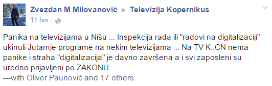 Da je na niškim medijima zbog najave inspekcije “zavladala panika” na društvenoj mreži “Fejsbuk” javnost je obavestio vlasnik TV „Kopernikus“ Zvezdan Milovanović komentarom da su „inspekcija rada i radovi na digitalizaciji ukinuli jutarnje programe na nekim televizijama“.