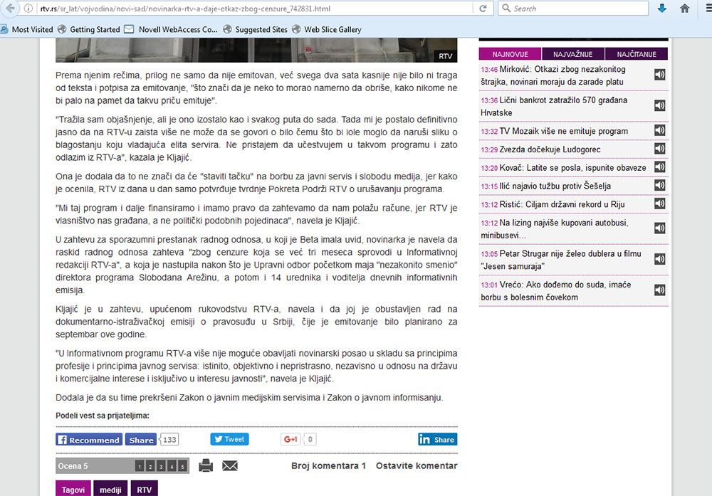 Dakle, vest je vrlo sadržajna, reklo bi se reprezentativna za režim u kome živimo. Ali, to još nije potvrda da ima cenzure. Vest je – slika nam to jasno pokazuje – ipak objavljena, i to baš na sajtu RTV-a, u 12.55. (Vidimo i to da je reč o vesti agencije Beta, pa ostaje da se pitamo šta će RTV-u agencijska vest za otkaz koji je novinarka te kuće dala samom RTV-u.) Međutim, par sati kasnije, kao što se vidi na Slici 2, na istoj adresi vesti više nema.